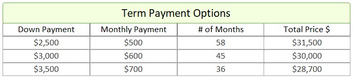 • Term Option 1: $2,500 down, $500 for 58 months, for a total price of $31,500