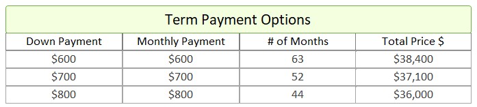- Term Option 3: $800 down, $800 for 44 months, for a total price of $36,000