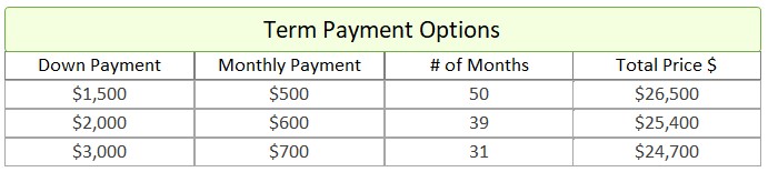 - Term Option 1: $1,500 down, $500 for 50 months, for a total price of $26,500