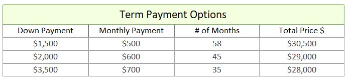- Term Option 1: $1,500 down, $500 for 58 months, for a total price of $30,500